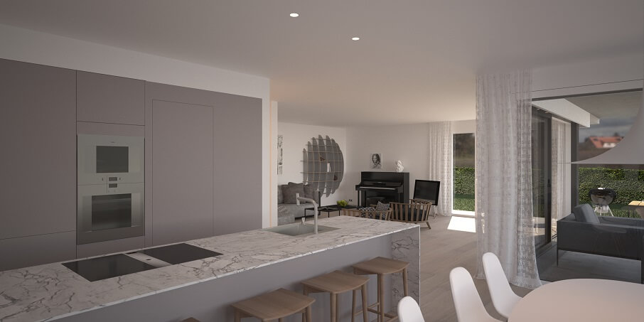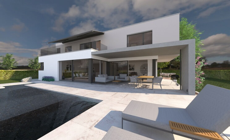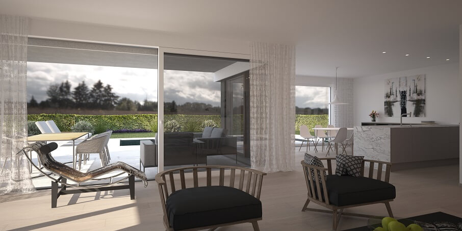 - Grosser gedeckter Sitzplatz flankiert von offenem Wohn-Essbereich