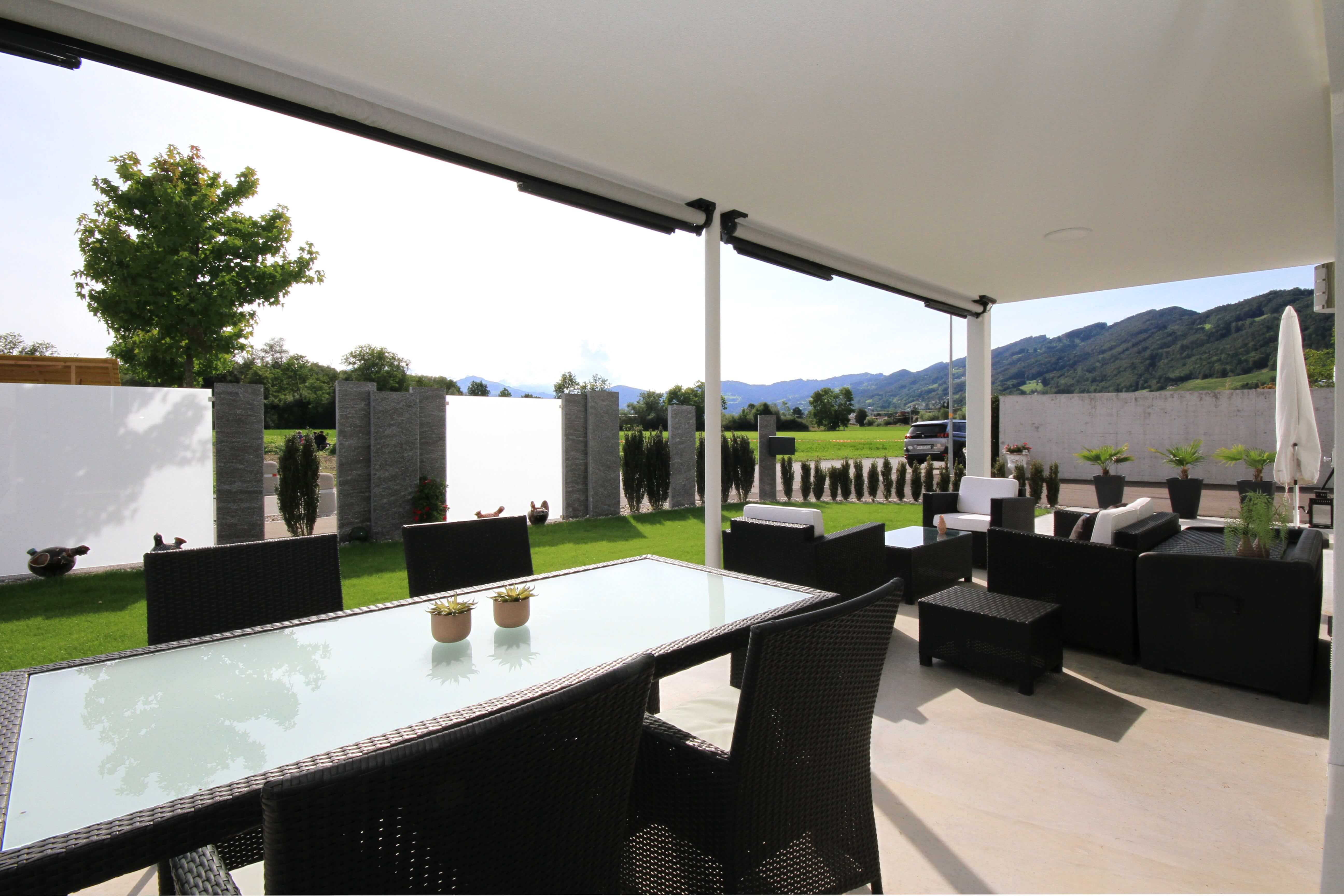- Grosser gedeckter Sitzplatz mit Sonnenstoren und Windschutzverglasung