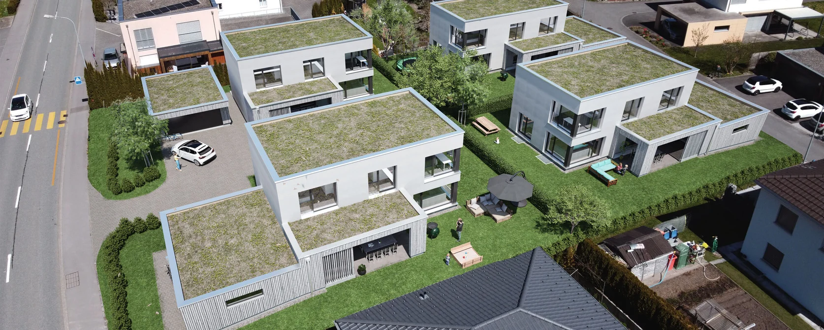 Mit grosszügigen, lichtdurchfluteten Räumen, nachhaltiger Haustechnik und begrünten Flachdächern bietet jedes Haus hohen Wohnkomfort und einen bewussten Umgang mit Ressourcen. Dank der optimalen Lage – ruhig, aber hervorragend erschlossen – geniessen Bewohner hier sowohl Erholung in der Natur als auch kurze Wege zu Städten und Zentren der Region.